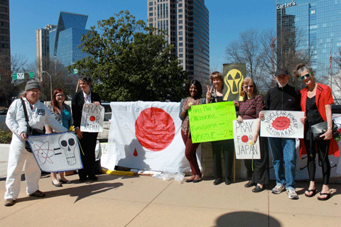 ATLANTA 3/11/14 — Activists with Nuclear Watch South and Georgia WAND gathered by the Japanese Consulate in Atlanta to remember the Tohoku earthquake and tsunami that devastated the northern coast of Japan on March 11, 2011, killing nearly 20,000 people and touching off three nuclear meltdowns at Fukushima Dai-ichi nuclear complex. The radiological situation in Japan is still not under control and 135,000 people by official estimates are still evacuated from their ancestral homes.