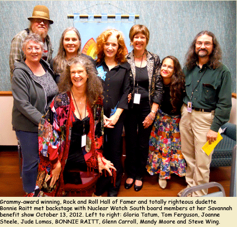 SAVANNAH 10/13/12: Bonnie Raitt put her award-winning SLIPSTREAM tour in support of work to stop U.S. nuclear expansion. In Savannah, Georgia her show benefited NUCLEAR WATCH SOUTH, Alliance for Nuclear Accountability, and South Carolina Sierra Club. NUCLEAR WATCH SOUTH came out in force and launched the Stop CWIP Campaign. We are eternally grateful to Bonnie for a lifetime of commitment to making the world a better place through music and personal activism. Guacamole Fund and Musicians United for Safe Energy produced the green tour. LONG MAY YOU ROCK!!!
