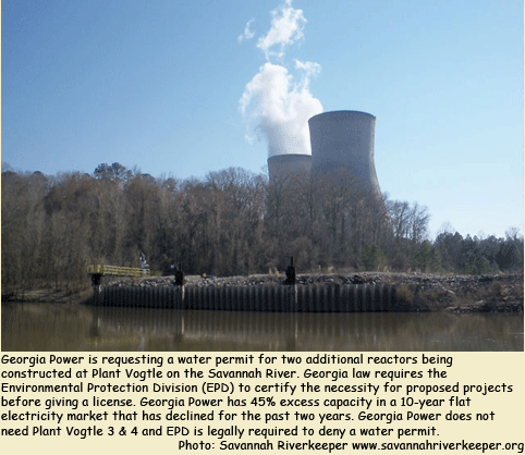 According to Georgia Legal Code, EPD is required to consider whether water withdrawals are “reasonably necessary” to meet the applicant's needs. Since Vogtle 3&4 are not needed, Georgia Power therefore does not need to use water from the Savannah River’s and EPD should deny the permit.