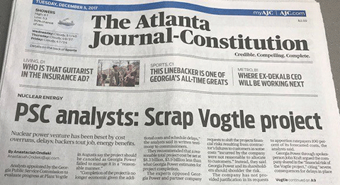 12/11/2017ATLANTA 12/6/17: Public interest groups and private citizens will converge on the Georgia Public Service Commission in December to confront Georgia Power about its Vogtle 3 & 4 construction fiasco at the 17th Semi-Annual Vogtle Construction Monitoring Review (VCMR). These reviews have occurred roughly every six months since construction commenced on Vogtle 3 & 4 reactors in Burke County in 2010, but this is the first time that Commissioners have officially asked the question whether to cancel the troubled project which is at least five years behind schedule and has doubled in price to $25 billion. The only other reactors under construction in the U.S. were cancelled by South Carolina utilities on July 31, 2017, following the bankruptcy of Westinghouse in March.