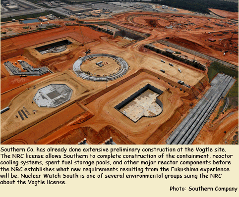 A major legal challenge has been filed charging the NRC with violating federal law to issue the license without considering the important lessons of the catastrophic Fukushima accident in Japan and regarding the ways the Vogtle operation should be modified to protect public safety and the environment. The groups are asking federal judges to order the NRC to prepare a new environmental impact statement (EIS) for the proposed Vogtle reactors that explains how cooling systems for the reactors and spent fuel storage pools will be upgraded to protect against earthquakes, flooding and prolonged loss of electric power to the site. The EIS must also detail how emergency equipment and plans for the nuclear plant will be revised to account for accidents affecting multiple reactors on the Vogtle site, as happened at Fukushima.