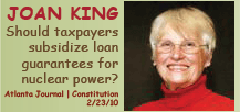 ATLANTA (2/16/10) ~ The “Nuclear Renaissance” promoted by Bush’s last administration reached a controversial milestone today with President Obama and Energy Secretary Chu’s much-anticipated announcement that $8.3 billion in tax-funded loan guarantees will be granted to Southern Company to construct two new reactors in Georgia. The reactors are proposed in addition to the two reactors already at Plant Vogtle in Burke County on the Savannah River near Augusta. Southern Company has not said that it will take the deal. Loan guarantee details were worked out in closed-door meetings between the U.S. Department of Energy and privately-owned electricity giant Southern Company.