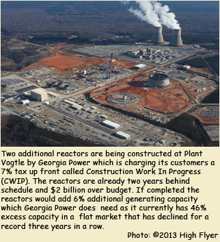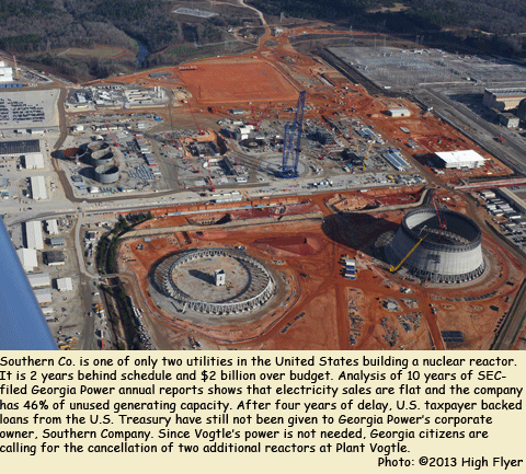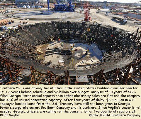 Since major Vogtle construction started two years ago the project has already fallen two years behind schedule and is $1.6 billion over budget. Vogtle partners are embroiled in a $900 million lawsuit with construction contractors and the reactors’ designers. Recent economic analysis of Georgia Power’s annual report data filed with the SEC from 2002-2012 shows that 4.1% annual growth forecasts have failed to materialize and retail and wholesale electricity sales are flat for the 10-year period. The annual reports also reveal that Georgia Power is overbuilt by 46% — more than twice the national standard.