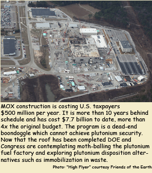 Nuclear Watch South Coordinator Glenn Carroll adds, "On top of Congress waking up to the massive mismanagement and cost overruns of the MOX plutonium program, our grassroots groups' legal intervention continues to find glaring problems with the MOX license application and design, problems even with the fundamental premise to provide security and impeccable accounting for 50 tons of plutonium. There is a cheaper and more efficient approach to plutonium security that we should revisit -- the concept of immobilizing plutonium as a waste, instead of wasting more tax dollars on the MOX boondoggle. The beauty of plutonium immobilization is that it closes the circle by securing the weapons plutonium in a glass matrix made from the waste generated in manufacturing the plutonium in the first place."